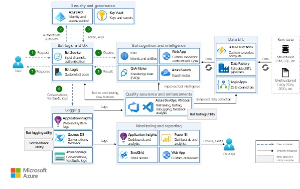 Microsoft Azure Bot is offering very sophisticated AI driven Bot service , also so called Azure Bot Framework service. It is a complete bot ecosystem with development visual tool called Bot Framework composer, testin tool Bot Framework Emulator and full stack including webchat component, monitoring, Bot service. The AI engine is Azure Cognitive Language Understanding (CLU) from Language service.